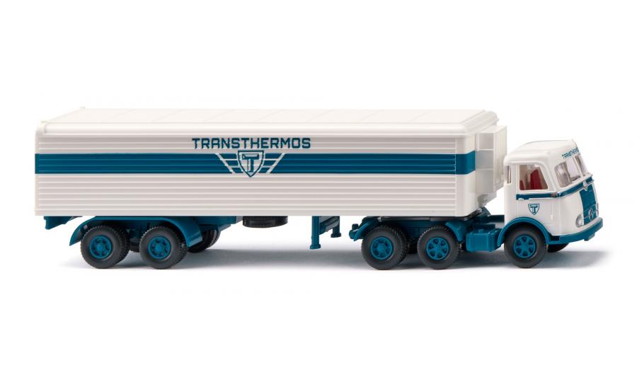 Driver's cab white, interior traffic grey, fifth wheel plate silver. Radiator grille, bumper part with chassis and cardan part, fenders and wheel rims light azure blue. Headlamps hand-painted in silver. Radiator grille with “MAN Diesel” lettering and ornamental strips painted silver. Sides of the driver’s cab with light azure blue Transthermos logo and fender edge in the same colour. Transthermos lettering on the front face of the roof. Trailer chassis with support rollers, double fenders and wheel rims light azure blue. White 20' refrigerated container with bright azure stripes on the sides and bright azure Transthermos lettering. Red tail lights.