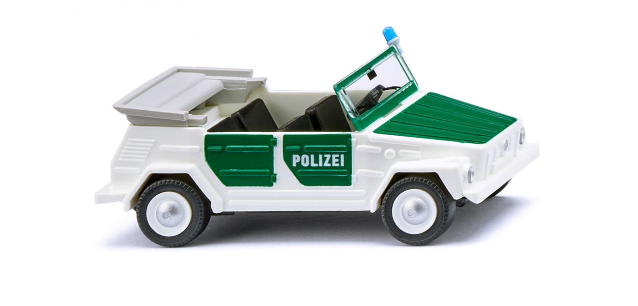 In den Nachkriegsjahrzehnten waren nahezu alle Fahrzeuge der Wolfsburger Autobauer bei den Landespolizeibehörden gesetzt. Sogar der legendäre VW 181, der einstige Bundeswehr Kübelwagen, hielt in vielen Bundesländern Einzug in die Fuhrparks der Polizei. Vor allem dort, wo die Einsatzorte eine gewisse Geländegängigkeit erforderlich machten, so dass der robuste, allerdings nicht allradtaugliche Kübelwagen oft bis in die Neunzigerjahre im Einsatz war. WIKING miniaturisierte den VW 181 in typischer Zweifarbgestaltung jener Jahre, die gerade durch die separat ausgeführten Türen in der Seitenansicht besonders auffällt. Als der VW 181 auf der IAA 1969 vorgestellt wurde, war seine automobile Berufung eigentlich zunächst rein militärischer Natur. Nachdem die europäischen Länder eigentlich in den Sechzigerjahren gemeinsam ein Jeep-Pendant bauen wollten, damit aber scheiterten und dann auch noch der DKW-Munga auslief, geriet die Bundeswehr unter Druck. VW handelte und setzte den Typ 181 auf einen Plattformrahmen, der VW Käfer steuerte den Boxermotor bei.