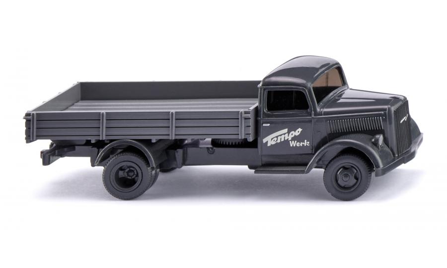 Laubgrünes Fahrerhaus. Getönte Verglasung, frontseitig gesilberter Zierrat sowie Opel-Logo und Scheinwerfer gesilbert. Türgriffe silber. Fahrgestell mit Sattelplatte und Kotflügel in schwarzgrau. Felgen in laubgrün. Laubgrüne Aufliegerpritsche mit mausgrauem Einlegeboden. Aufliegerfahrgestell und hintere Kotflügel in schwarzgrau. Heckleuchten an Zugmaschine und Auflieger rot bedruckt. Pritsche mit Logo „Dinkel“ in schwarz.